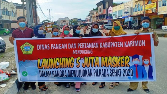 KARIMUN, kabarkarimun.co.id – Dinas Pangan dan Pertanian (Dispaperta) Kabupaten Karimun terus bergerak melakukan pembagian masker gratis. Selain mendukung pencanangan penyebaran 5 juta masker di Provinsi Kepri, juga sebagai upaya memutus matarantai penyebaran Covid 19 di Bumi Berazam.