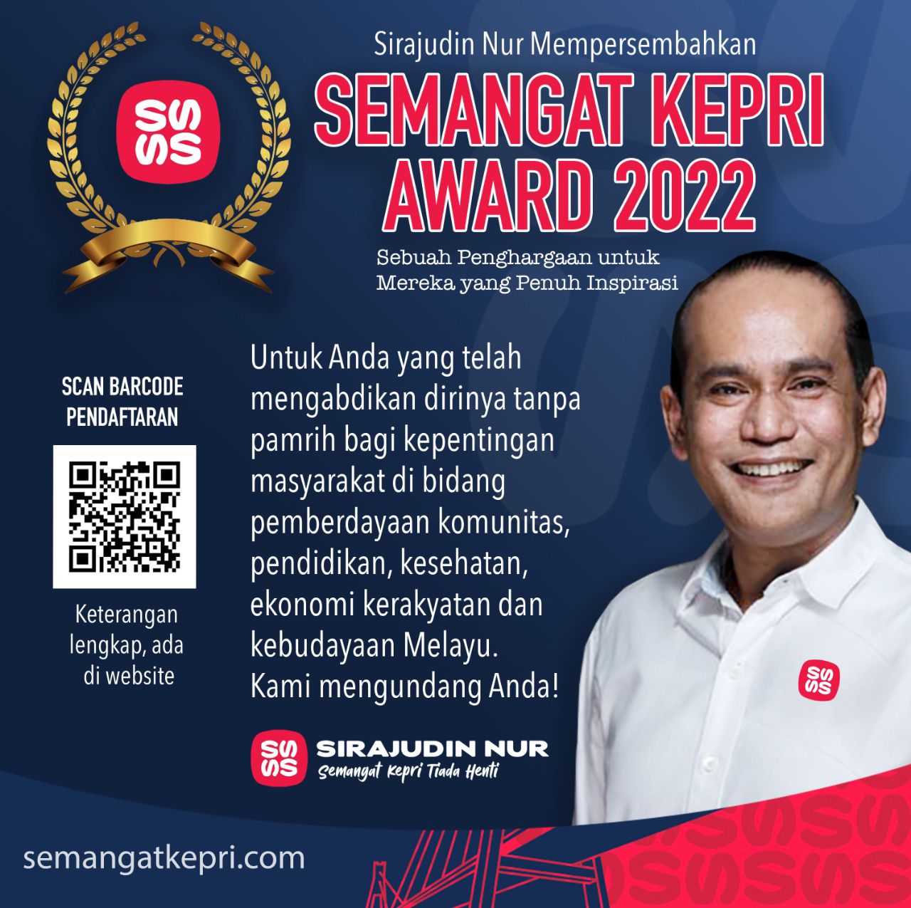 Bagi orang perorang maupun kelompok (minimal 3 orang) yang selama ini telah berbuat untuk masyarakat Kepri, Sirajudin Nur mengundang untuk mendaftar melalui website semangatkepri.com, atau mengisi data di formulir online https://forms.gle/LxMCUcV6MiowTWsF7.