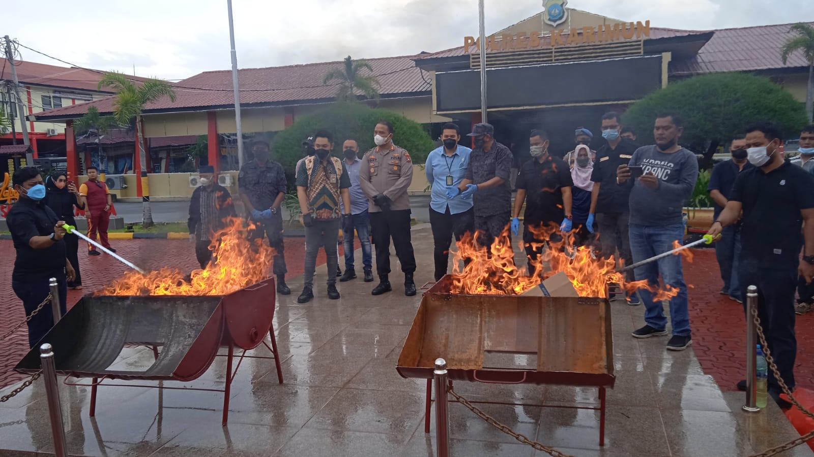 Kegiatan pemusnahan barang bukti dipimpin langsung oleh Kapolres Karimun AKBP Tony Pantano SIK.SH, Kasatresnarkoba Polres Karimun AKP Elwin Ristanto SIK, Kasubsipenmas Sihunas Iptu Jordan Manurung.