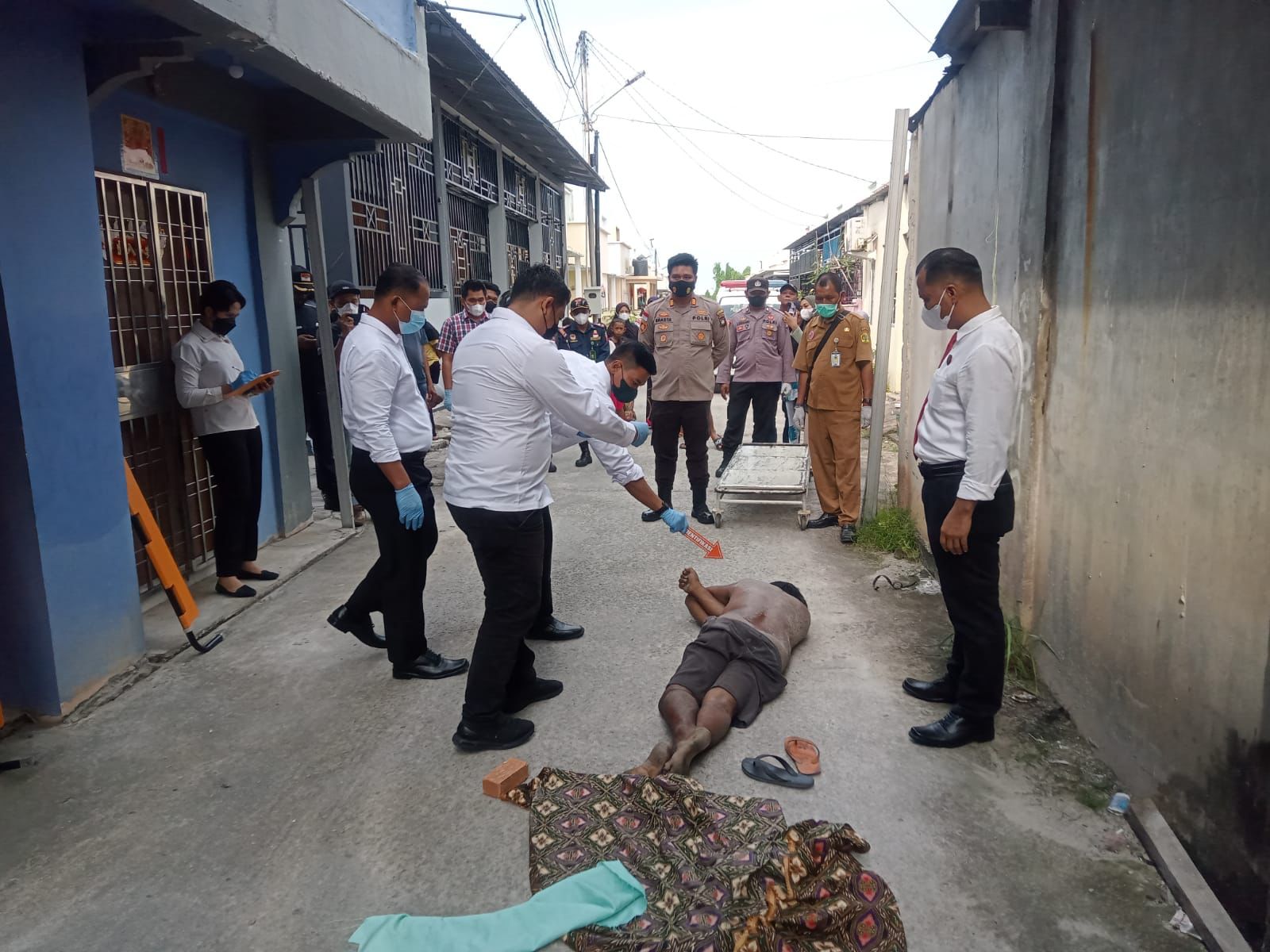 Sosok mayat tersebut awalnya ditemukan oleh warga tergeletak di jalan hanya menggunakan celana pendek berwarna hitam tanpa menggenakan baju dengan posisi terlungkup.