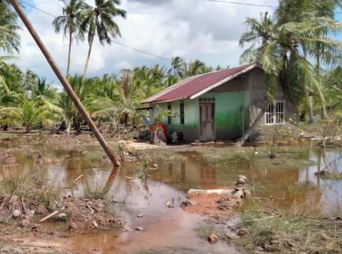 “Lihatlah berbagai tanaman kelapa, karet maupun sayuran milik warga mati akibat genangan air laut,” keluh Iriadi.