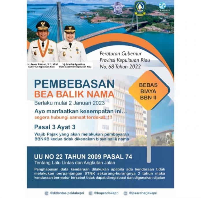 Pembebasan biaya balik nama BBN tahap II tersebut sesuai dengan peraturan Gubernur Provinsi Kepri no.68 tahun 2022.