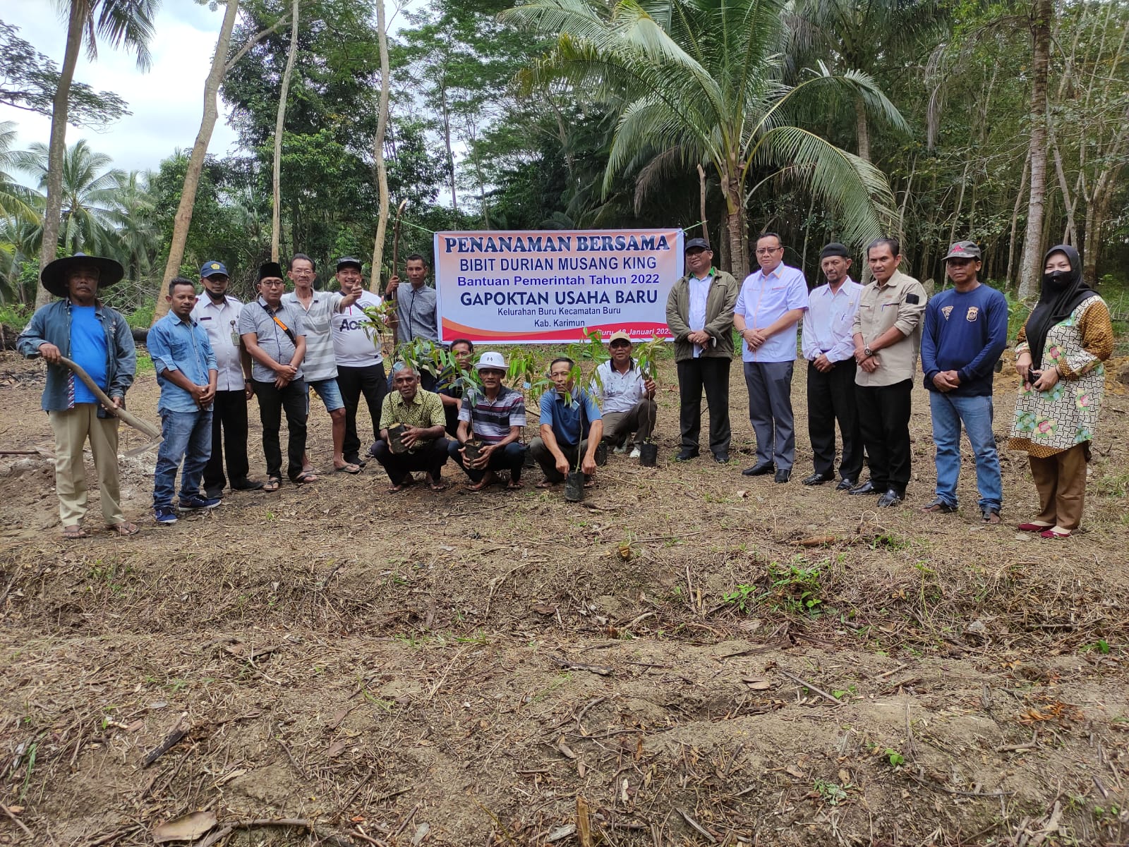 “Kami apresiasi kepada Dinas Peternakan dan Pertanian Karimun yang telah berusaha mendapatkan bantuan bibit dari APBN sehingga bisa sangat membantu para petani,” ungkap Adi Hermawan di sela penanaman 1000 bibit durian Musang King di lahan seluas 10 hektare Kelurahan Buru, Kecamatan Buru, Rabu (18/01/2023).
