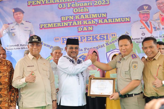KARIMUN, kabarkarimun.co.id – Bupati Karimun Aunur Rafiq menyerahkan 114 sertifikat tanah kepada masyarakat di Gang Perdamaian, Kelurahan Sei Lakam Barat, Kecamatan Karimun, Jumat (3/2/2023).