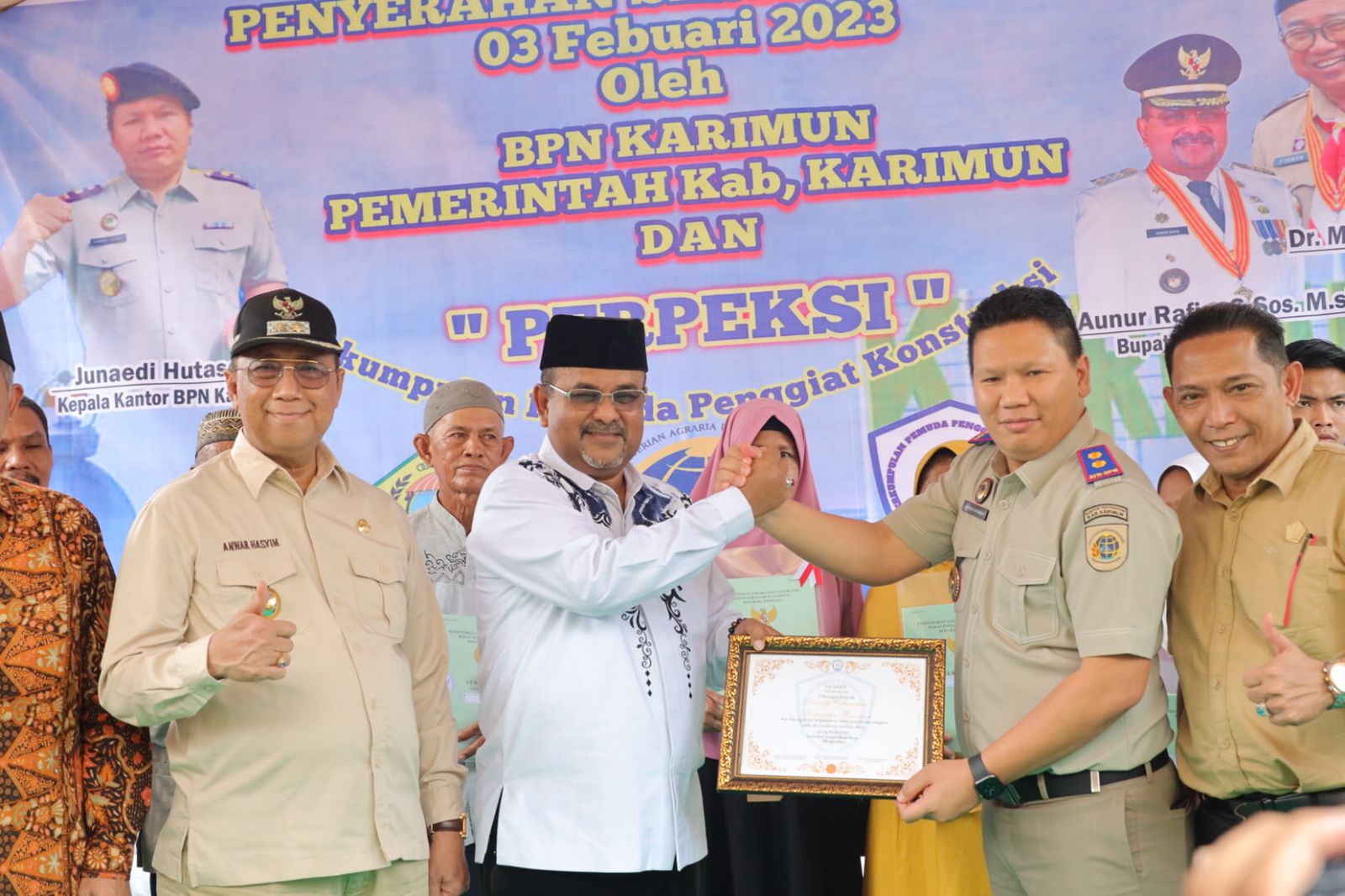 Wakil Bupati Karimun Anwar Hasyim, Sekretaris Daerah Muhammad Firmansyah, Ketua Komisi I DPRD Sulfanow Putra, Kepala BPN Karimun Juanedi S Hutasoit dan Ketua Perpeksi Muhd Effendi juga hadir dalam kegiatan penyerahan sertifikat tanah tersebut.