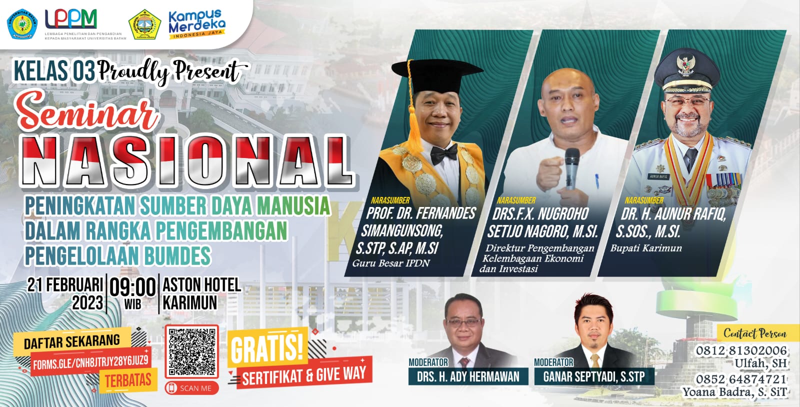 “Kegiatan seminar ini juga akan dihadiri oleh pihal bumdes se Kab.Karimun, pihak desa serta kelurahan. Turut diundang mahasiswa S2 serta S3 Uniba Batam, mahasiswa S2 yang dari Pinang serta mahasiswa yang ada di Universitas di Kabupaten Karimun,” terangnya.