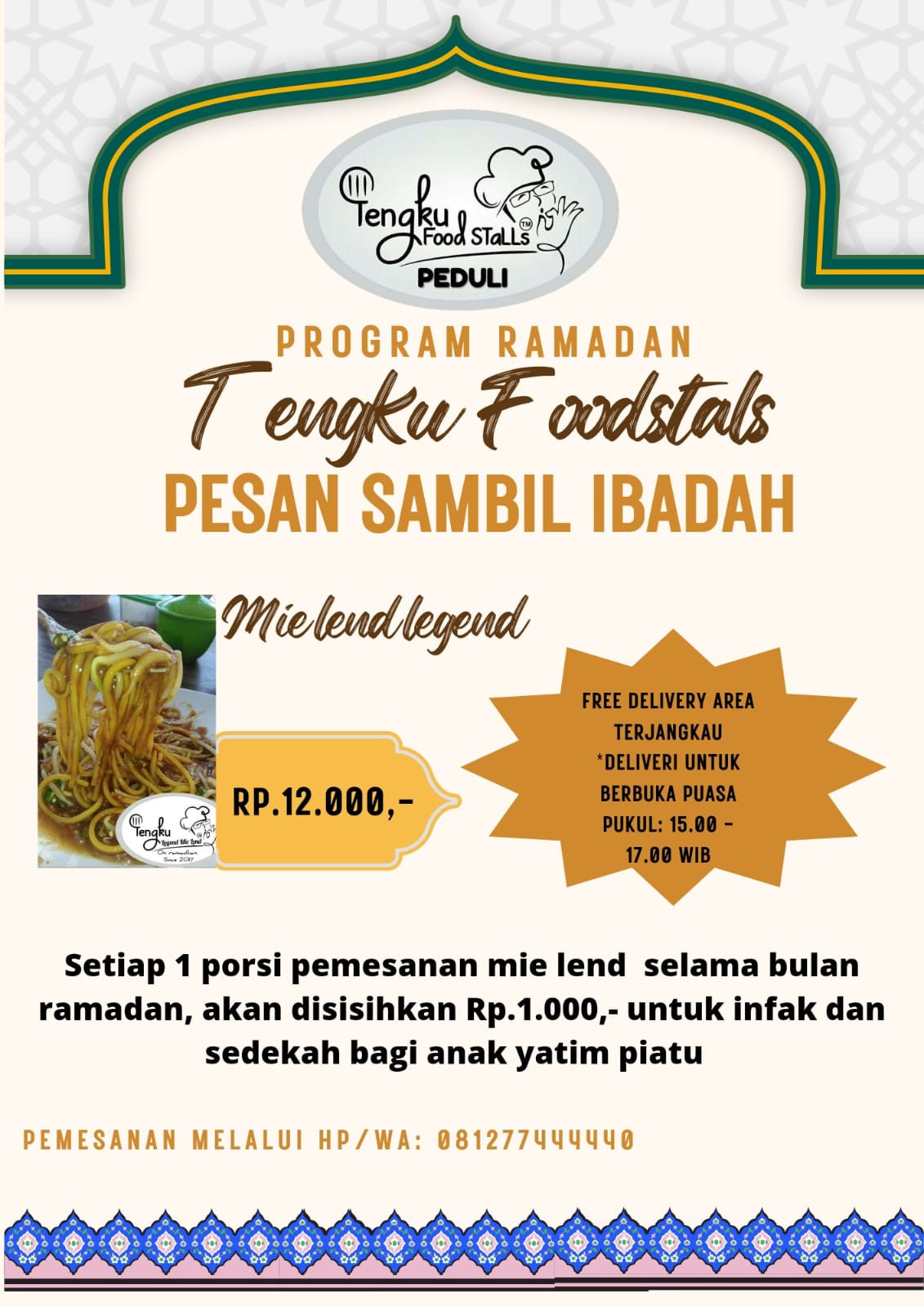 “Untuk pemesanan dapat langsung menghubungi nomer kontak tertera, pengantaran mie lend untuk berbuka puasa dari jam 15.00 WIB hingga pukul 17.00 WIB. Untuk area terjangkau gratis ongkir,” tambahnya.