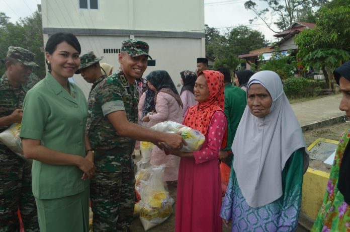 Dandim 0317/TBK membagikan bantuan sembako secara simbolis kepada perwakilan warga serta memberikan bantuan buku tulis bagi siswa dan siswi SDN 006 dan SMP 03 Satu Atap Belat. (*/nku)