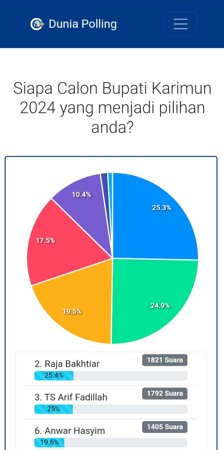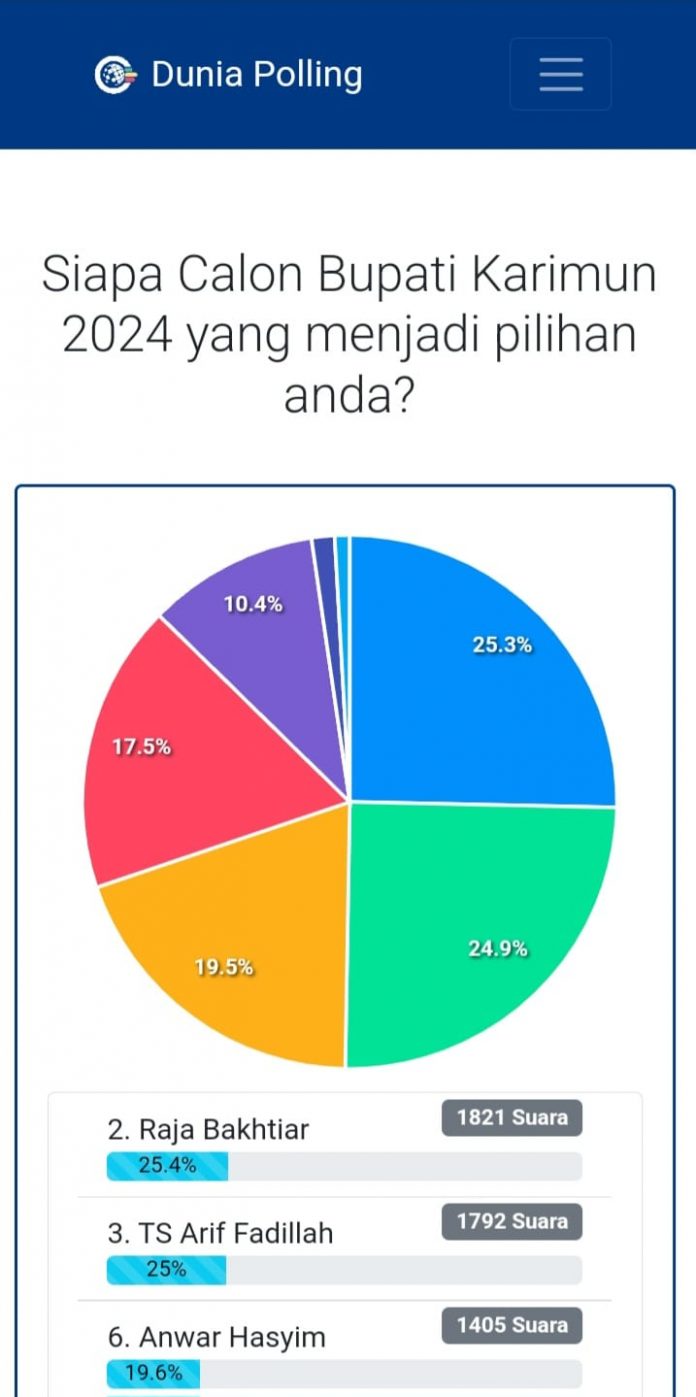 Belum diketahui siapa yang membuat poling tersebut. Namun dari pantauan kabarkarimun.co.id, saat ini sudah 7.188 suara yang memilih dengan persentase: 25,4 % memilih Raja Bakhtiar, 25% memilih TS Arif Fadillah, 19,6% memilih Anwar Hasyim, 17,6% memilih Muhammad Firmansyah, 10,4% memilih Ing Iskandarsyah, 1,4% Rocky Bawole, dan 0,9% Rasno.