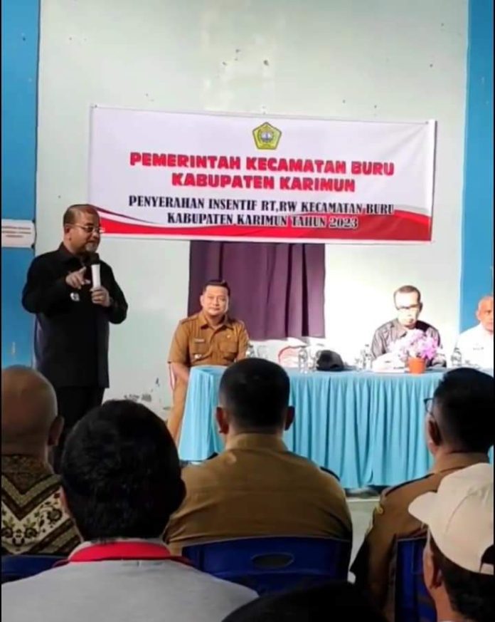 KARIMUN, kabarkarimun.co.id – Bupati Karimun Aunur menyerahkan insentif untuk 59 ketua RT/RW se Kelurahan Buru, dan Lubuk Puding, Kecamatan Buru, Rabu (12/7/2023).