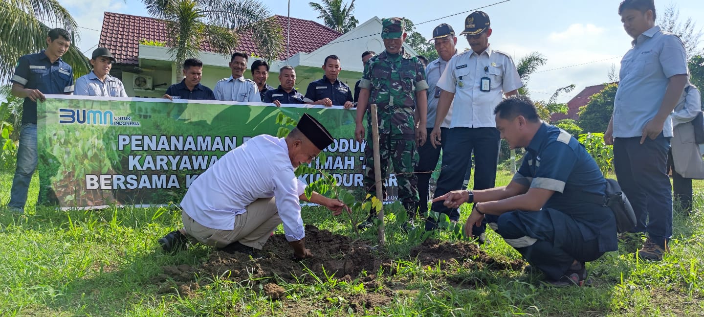 KUNDUR, kabarkarimun.co.id – PT Timah Tbk bersama Pemerintah Kecamatan Kundur menanam 180 bibit buah-buahan di areal kantor Camat Kundur, Kabupaten Karimun, Rabu (13/9/2023).