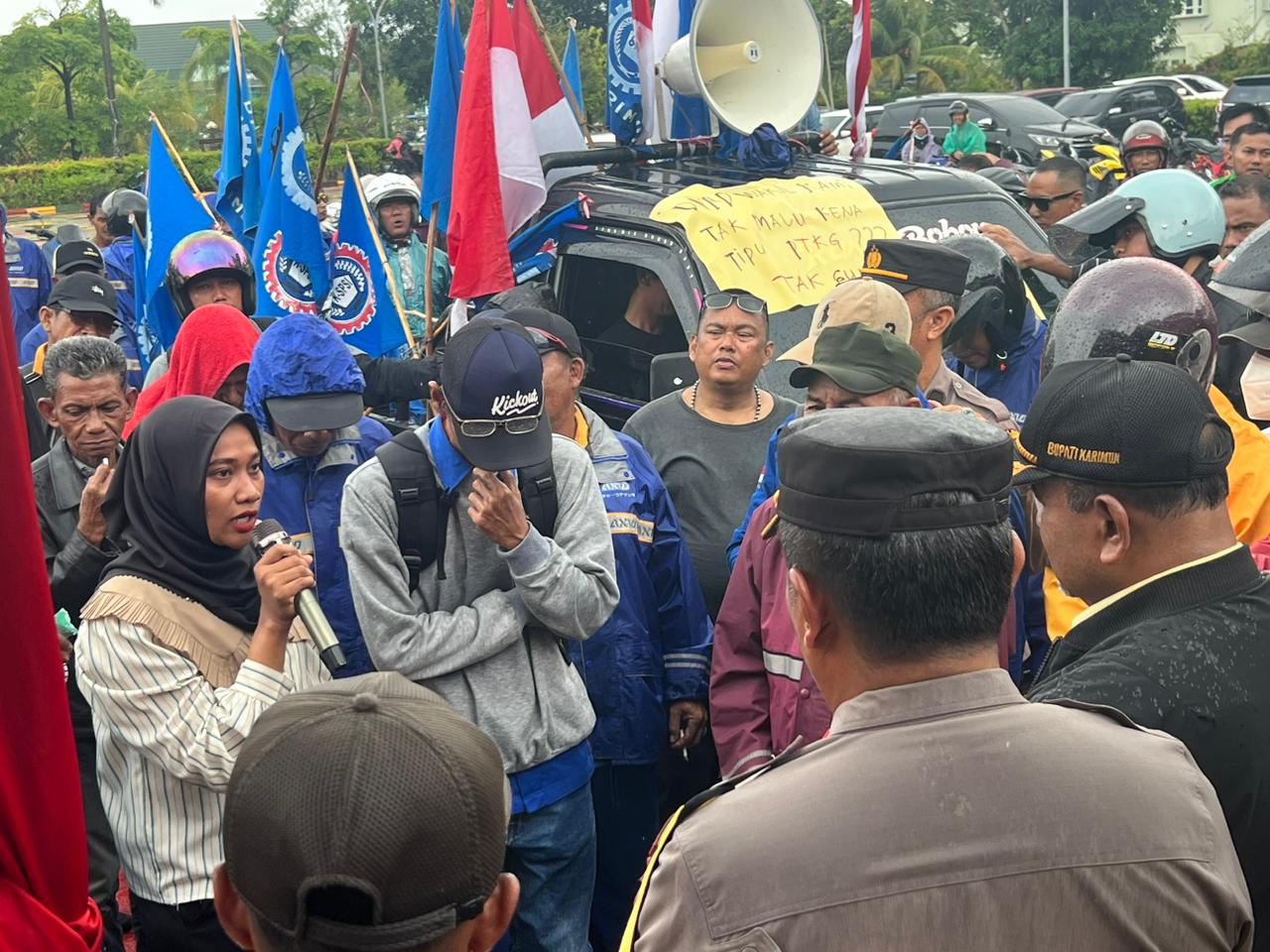 Unjuk rasa tersebut digelar lantaran pihak eks karyawan, dan tenaga pengajar mengaku kecewa dengan sikap Bupati Karimun, Aunur Rafiq.