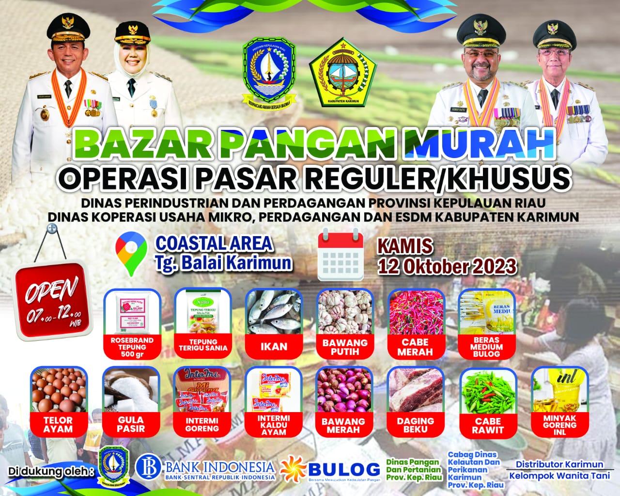 KARIMUN, kabarkarimun.co.id – Dinas Perindustrian dan Perdagangan Provinsi Kepri bekerjasama dengan Dinas Koperasi, Usaha Mikro, Perdagangan dan ESDM Kab.Karimun menggelar Bazar Pangan Murah Operasi Pasar Reguler/Khusus.