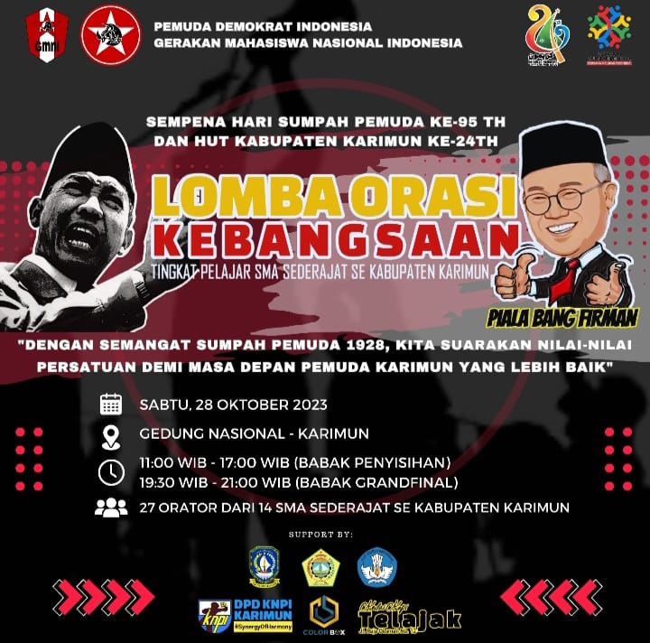 KARIMUN, kabarkarimun.co.id – Memperingati Hari Sumpah Pemuda ke 95 yang jatuh pada tanggal 28 Oktober 2023, Pemuda Demokrat Indonesia Cabang Karimun bersama Gerakan Mahasiswa Nasional Indonesia (GMNI) menggelar lomba pidato tingkat pelajar.