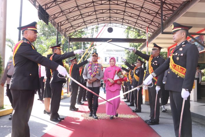 Kapolres Karimun AKBP Fadli Agus, S.I.K, M.H., M.M. yang baru tiba disambut dengan pengalungan bunga, dilanjutkan dengan jajaran hormat yang disambut prosesi pedang pora.
