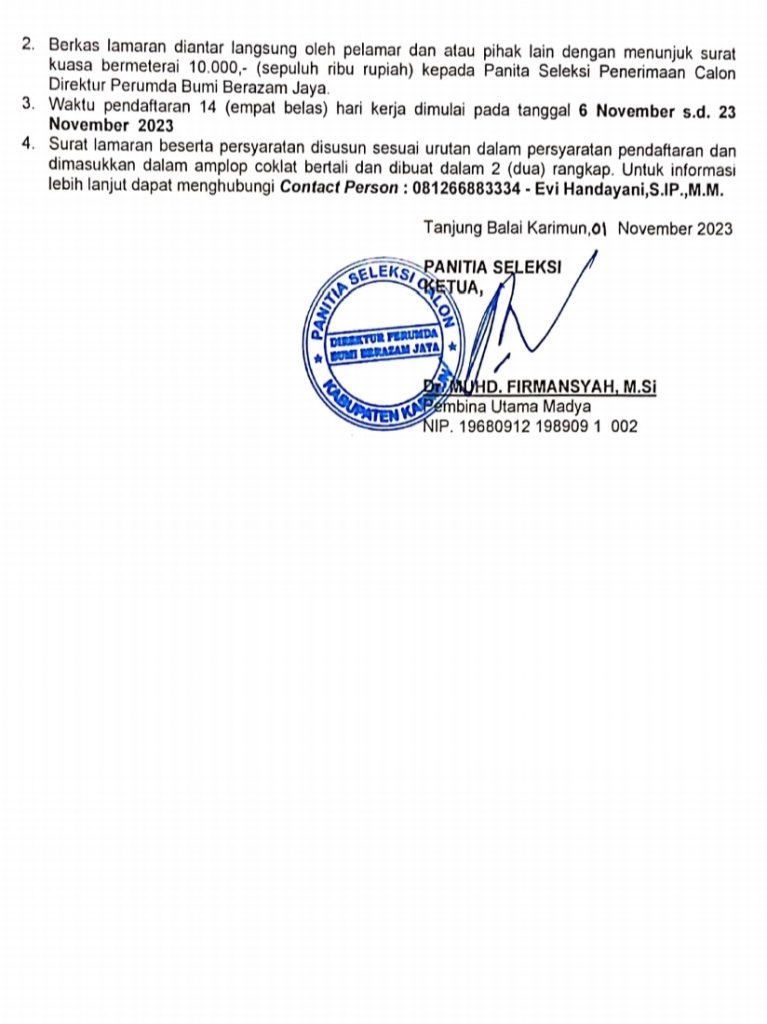“Surat lamaran ditulis tangan dengan ballpoint warna hitam di atas kertas segel atau kertas bermaterai Rp10.000 dilengkapi persyaratan dengan mencantumkan jabatan yang akan dilamar. Berkas lamaran ditujukan kepada Bupati dengan alamat Panitia Seleksi Penerimaan Calon Direktur BUMD Perusda Bumi Berazam Jaya cq Bagian Perekonomian Setda Karimun JL. Jend. Sudirman nomor 1, Poros-Meral, Kabupaten Karimun,” paparnya. (ifa)