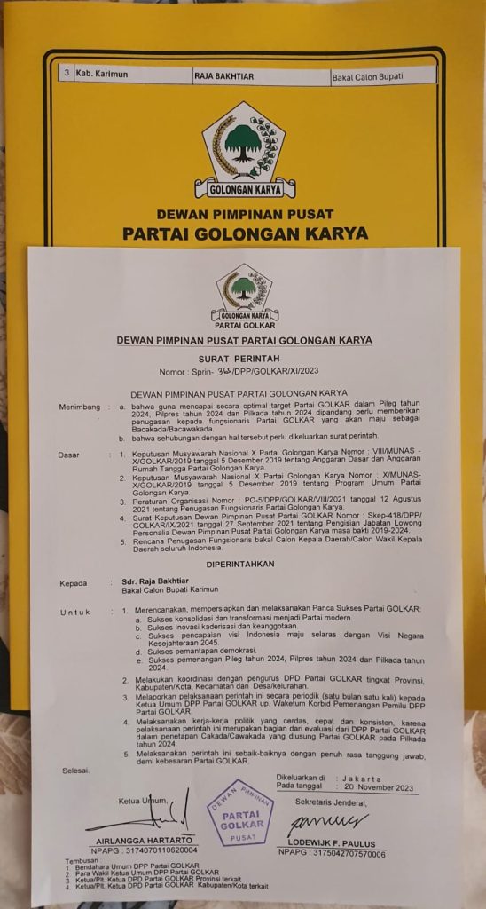 Dalam surat perintah tersebut, kedua bakal calon Bupati Karimun dari Partai Golkar tersebut diminta untuk melakukan berbagai tugas politik sebagai bahan evaluasi dari Golkar untuk menetapkan siapa yang akan mendapatkan tiket ke Pilkada Kab.Karimun 2024.