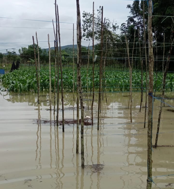 Akibat terendam banjir, lahan yang ditanami berbagai jenis sayuran seperti jagung, cabai, terong, tomat, timun dan lainnya pun terancam gagal panen.