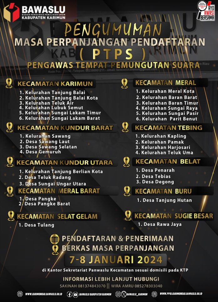 KARIMUN, kabarkarimun.co.id – Bawaslu Karimun memperpanjang masa perpanjangan pendaftaran petugas Pengawas Tempat Pemungutan Suara (PTPS) untuk beberapa kecamatan se Kab.Karimun.