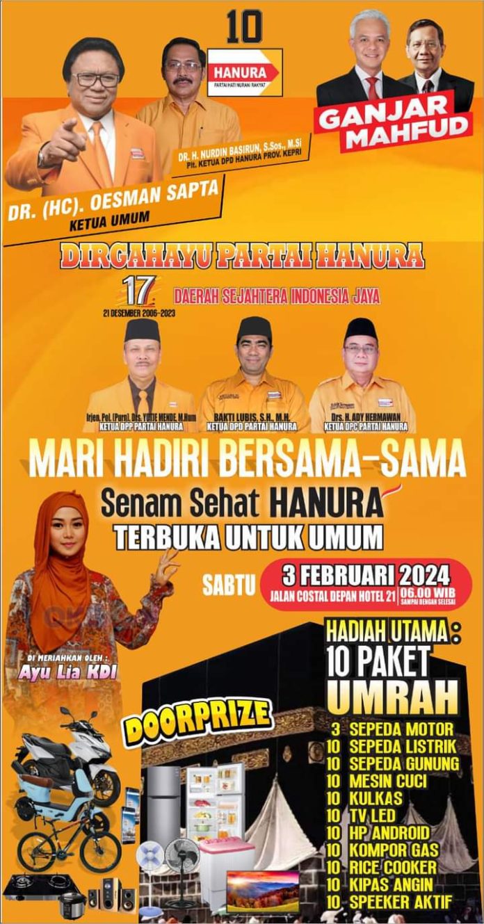 KARIMUN, kabarkarimun.co.id – Dalam Rangka Peringatan HUT yang ke 17 Tahun, Partai Hanura menggelar kegiatan senam sehat bertempat di Coastal Area (depan Hotel 21) Karimun, Sabtu (3/2/2024) mendatang.