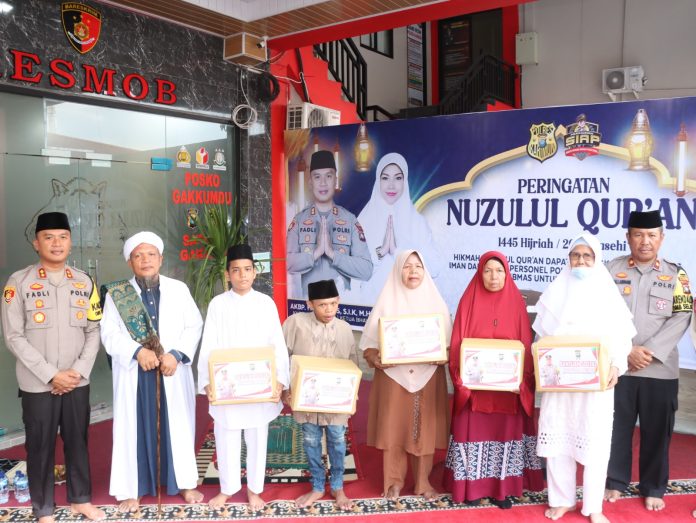 Selain tausiyah, Nuzulul Quran yang dihadiri Kapolres AKBP Fadli Agus, SIk MH turut memberi santunan kepada anak yatim dan Warakawuri.