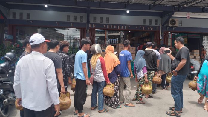 Seperti yang terjadi di pangkalan Wenmart, Batu Lipai, Kelurahan Baran Timur, Kecamatan Meral, Kamis (18/4/2024). Antrian warga mengular sejauh belasan meter.
