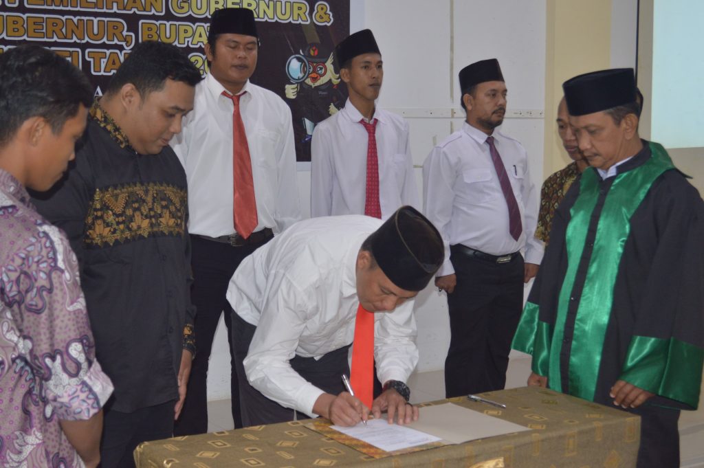 Usai pelantikan sekaligus pengucapan ikar sumpah janji, diikuti penandatangan secara simbolis ikrar dan pakta itegritas anggota panwaslu kelurahan/desa. (ifa)