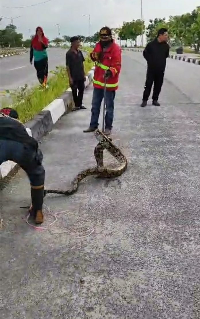 Menurut Hendra, ular sanca kembang tersebut sedang diam di rerumputan trotoar tak jauh dari panggung rakyat putri kemuning, Coastal Area.