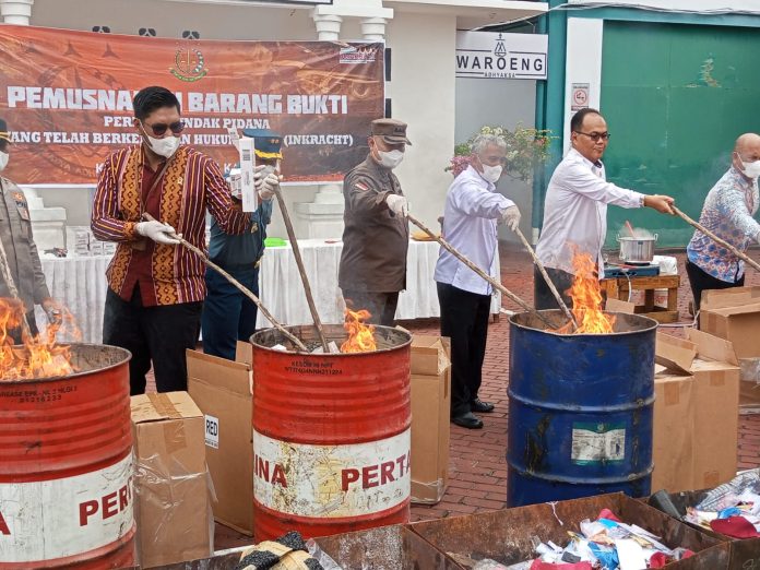 “Perkara tindak umum lainnya bbnya tetdiri dari handphone dan pakaian, serta tindak pidana kepabeanan yakni 3.090 karton rokok tanpa cukai. Namun untuk BB rokok, hari ini dimusnahkan 100 karton terlebih dahulu mengingat lokasi pemusnahan yang tidak memungkinkan,” jelasnya.