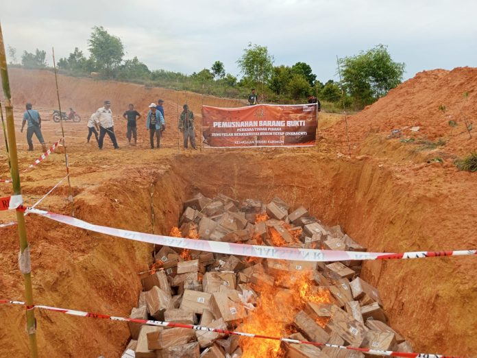 Pemusnahan 2.990 kardus rokok tersebut dilakukan dengan cara dibakar di lubang sedalam lebih kurang 4 Meter yang dibuat menggunakan alat berat serta jauh dari pemukiman warga.