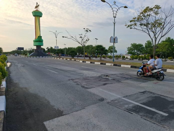 Jalan berlubang terlihat hampir di sepanjang jalan dari rumah burung hingga Tugu MTQ. Jika tidak berhati-hati, jalan berlubang bisa membahayakan pengendara.