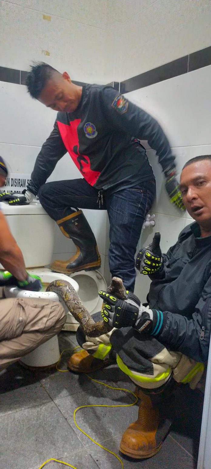 Setelah berjam-jam ditangani, akhirnya ular tersebut berhasil dikeluarkan dari dalam lubang closet.