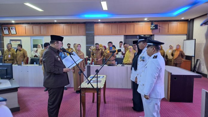 melakukan pengukuhan serta menyerahkan SK perpanjangan masa jabatan selama dua tahun ke depan kepada 38 kepala desa se Kabupaten Karimun, Senin (22/7/2024).