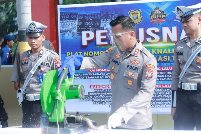 KARIMUN, kabarkarimun.co.id – Satlantas Polres Karimun memusnahkan knalpot bising/knalpot brong, dan 31 Tanda Nomer Kendaraan Bermotor (TNKB) yang tidak sesuai hasil Operasi Patuh Seligi 2024, Selasa (30/07/2024).