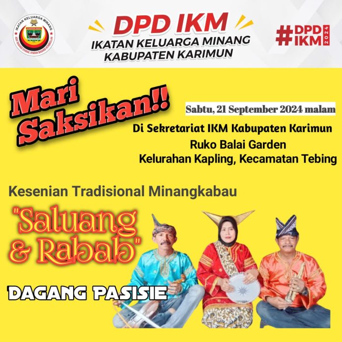 Kesenian khas ranah minang yakni Saluang, dan Rabab ini dipusatkan di Sekretariat DPD IKM Kabupaten Karimun, ruko Balai Garden, jalan Raja Oesman, Kelurahan Kapling, Kecamatan Tebing.