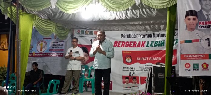 Demikian sebait pantun yang dibacakan Rocky Marciano Bawole sebagai Calon Wakil Bupati Karimun saat kampanye di Sei Bati Kelurahan Teluk Uma, Kecamatan Tebing, Selasa (12/10/2024) malam.