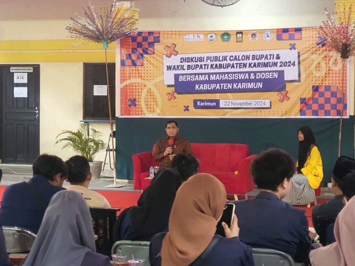 KARIMUN, kabarkarimun.co.id – Calon Bupati Karimun nomor urut 3 H.Bakti Lubis, S.H, M.H melaksanakan diskusi publik bersama dosen dan mahasiswa di Universitas Karimun (UK), Jumat, (22/11/2024).