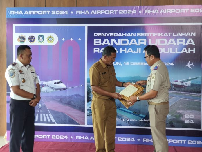 Lahan yang telah berstatus sertifikat oleh Badan Pertanahan Nasional (BPN) tersebut diserahkan oleh Sekda Karimun Djunaidy kepada pihak Bandara RHA, Senin (16/12/2024).