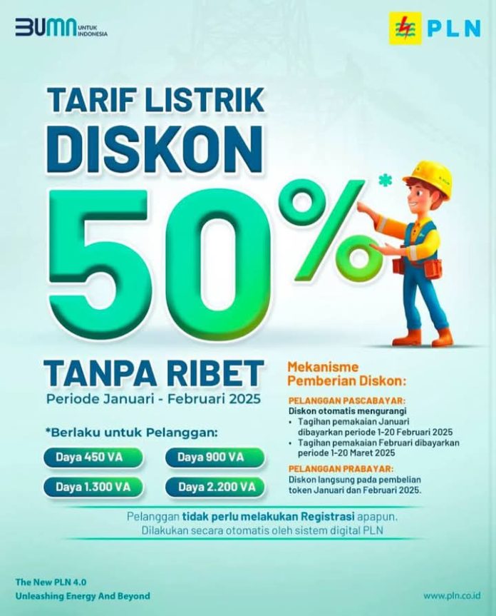 KARIMUN, kabarkarimun.co.id – Dalam rangka melindungi daya beli masyarakat atas pemberlakuan kenaikan Pajak Pertambahan Nilai (PPN) sebesar 12%, PLN memberikan diskon sebesar 50% pembayaran listrik prabayar dan pascabayar terhitung dari Januari hingga Februari 2025.