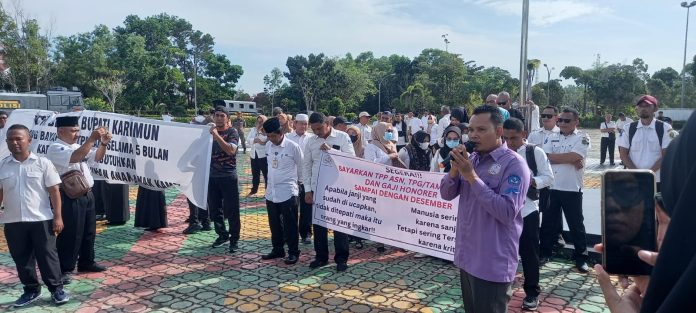 KARIMUN, kabarkarimun.co.id – Sejumlah ASN beserta guru, tetap menggelar aksi demo di depan Kantor Bupati Karimun, Rabu (8/1/2025).