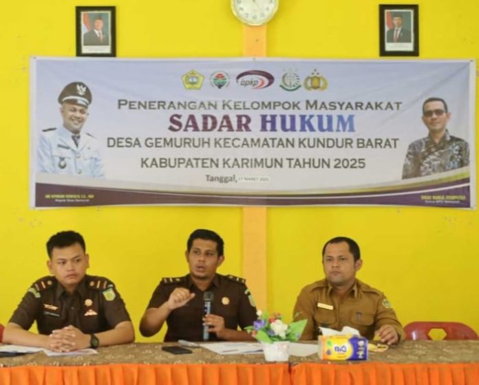 KUNDUR, kabarkarimun.co.id – Cabang Kejaksaan Negeri (Cabjari) Karimun di Tanjung Batu menggelar penyuluhan sadar hukum di Gedung Tok Macang desa Gemuruh, Kecamatan Kundur Barat, Rabu (19/3/2025).