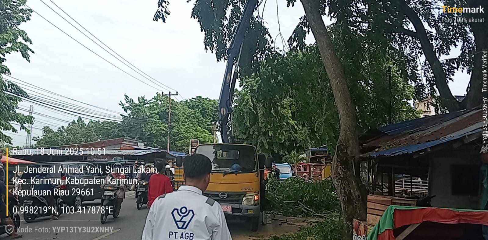 KARIMUN, kabarkarimun.co.id – PT Anva Gemilang Bersama (PT AGB) melakukan penebangan dahan pohon yang menjuntai di sepanjang Jalan Ahmad Yani Kolong, Kecamatan Karimun, Rabu (18/6/2025).